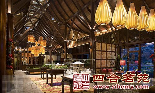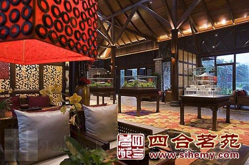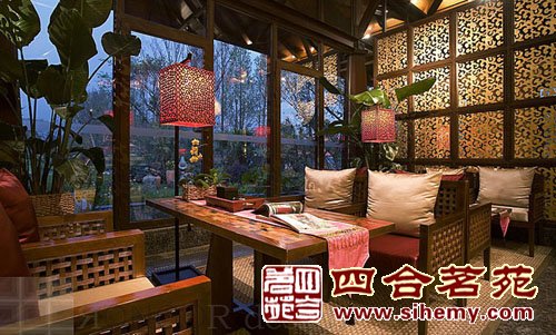 沒有奢華的描金彩繪但是傳統(tǒng)的木結(jié)構(gòu)和中式的花格燈飾自然之美更加吸引觀者的目光,設(shè)計(jì)色彩簡(jiǎn)單但不單調(diào)奢華的氣氛充盈了整個(gè)空間。