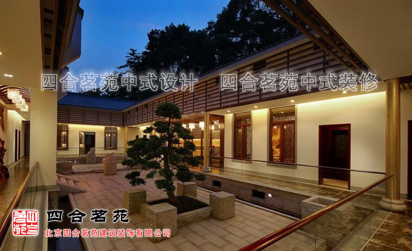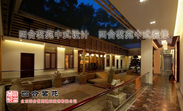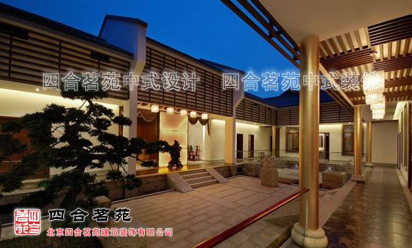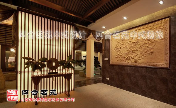 采用簡約手法對空間進(jìn)行優(yōu)化,送去復(fù)雜的古典形式,代之以整潔的界面、時尚的材質(zhì)、柔和的燈光,以抽象的意境凸顯現(xiàn)代氣質(zhì)。門廳只取頂部架構(gòu),照壁做得簡潔而通透,內(nèi)部配以柔和光帶,玲瓏剔透,牡丹浮雕也與花紋墻磚呼應(yīng)得體,而另一邊也簡到極致,只有光帶和家具。中央會客廳在視覺水平線以草書裝飾,使青磚墻面更具層次感。