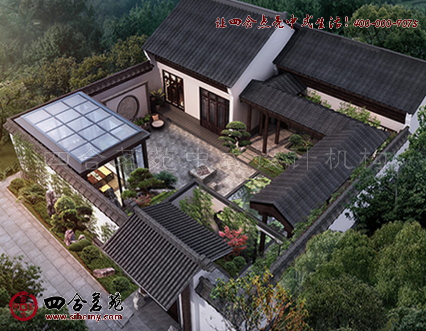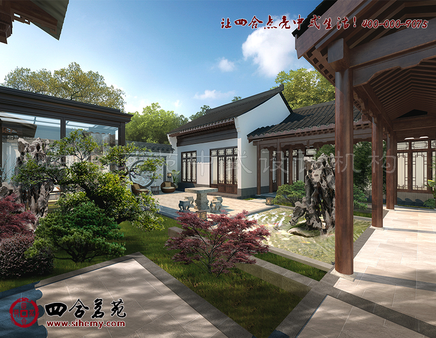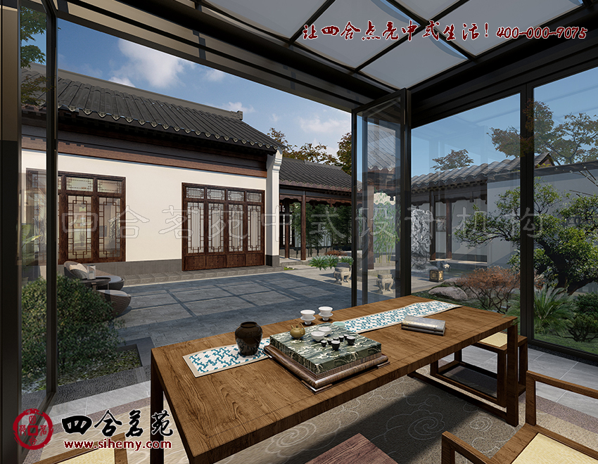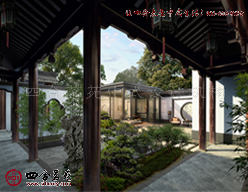 對于中式元素運用,可以勾勒出更多設計方案中的中式體驗。四合茗苑關注中式元素運用。粉墻黛瓦的院墻,漏窗花窗造型各異,色彩淡雅,在庭院中線條與色彩交相輝映中合院顯得溫馨而幽謐。