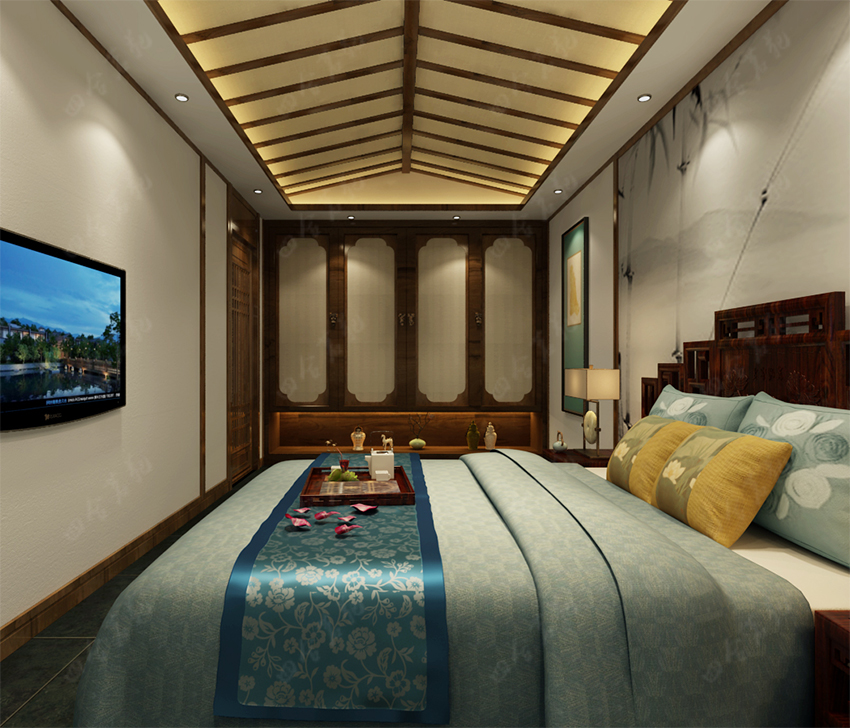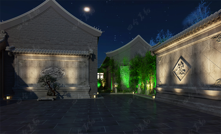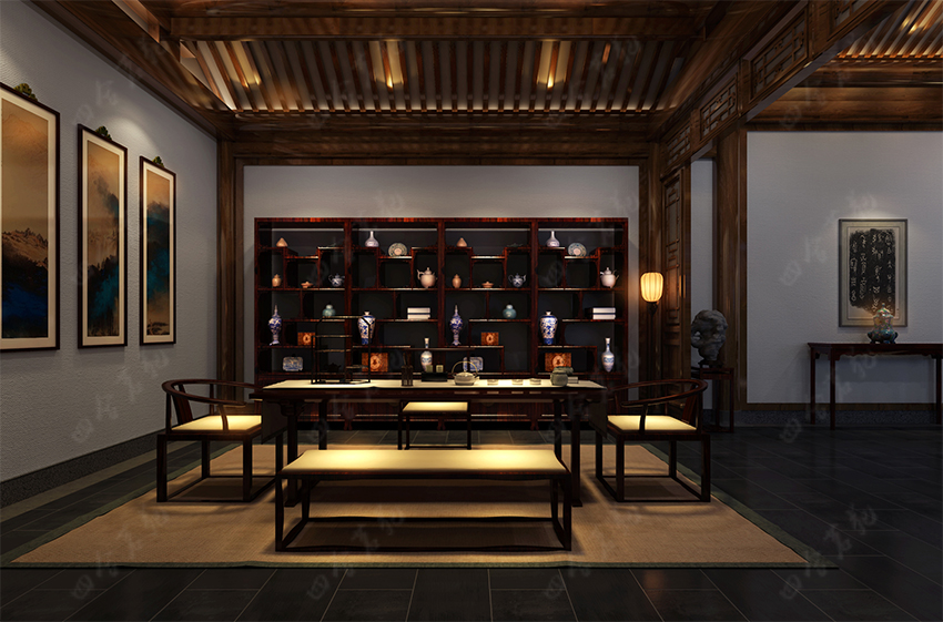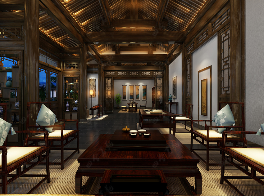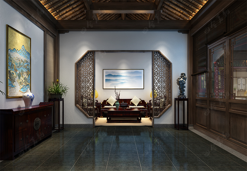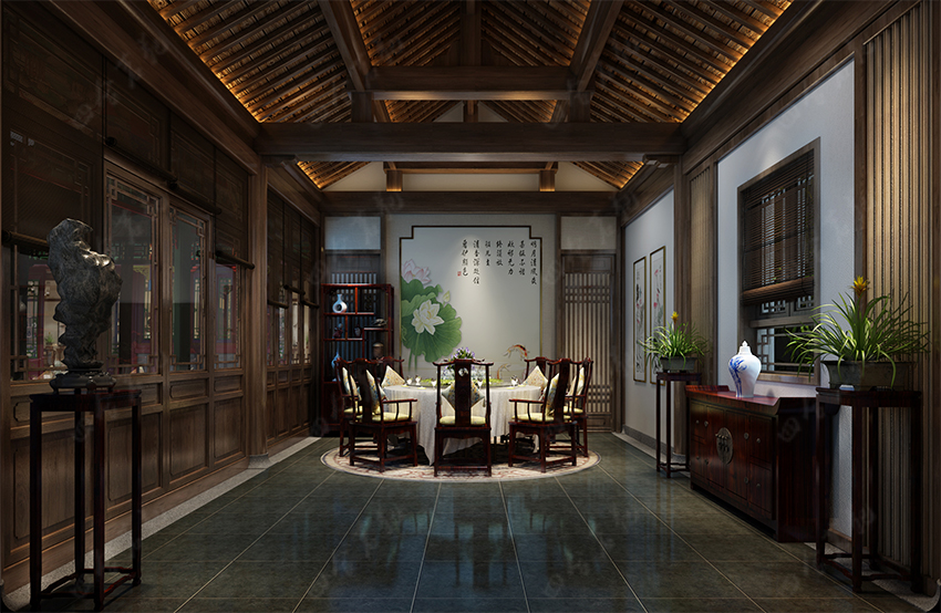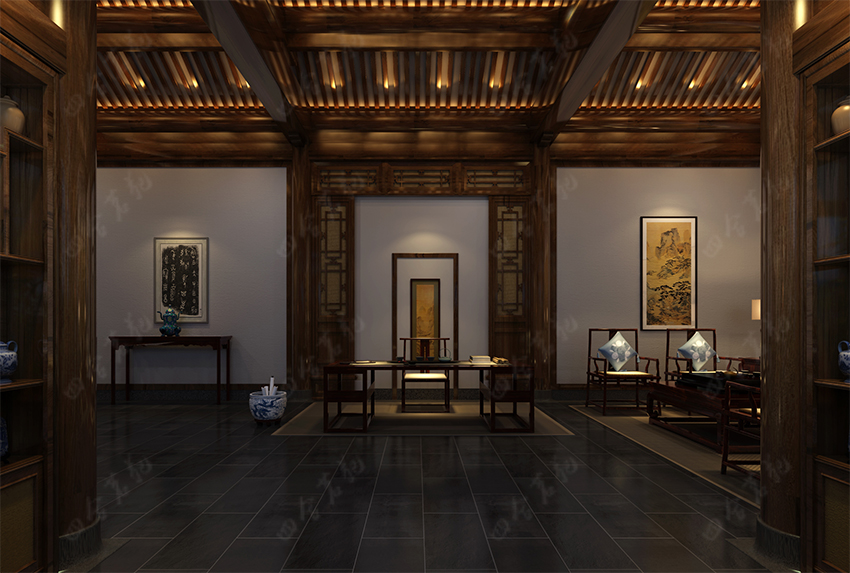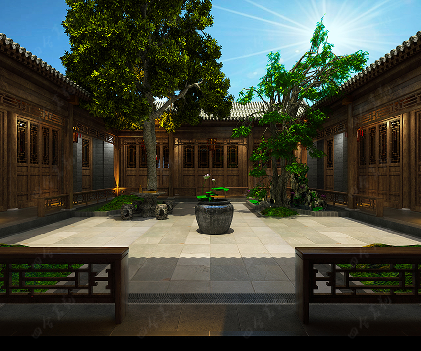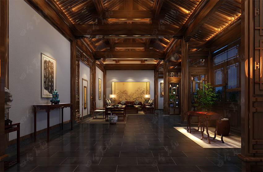 四合院設計崇尚自然情趣,不用過多的色彩裝飾,以免打破了優雅的情調。色彩以沉穩的深色系為主,家具大面積使用原木色,局部運用暖黃燈光的鋪排,這樣整個空間的色彩得到良好的協調統一。